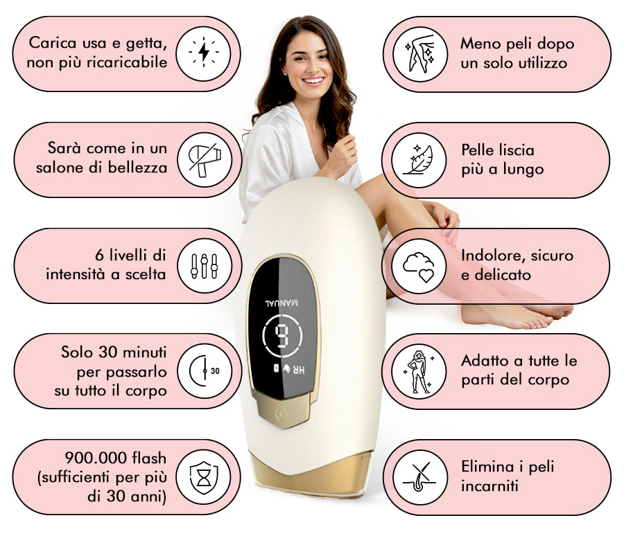 IPL sta per Luce Pulsata Intensa. Funziona in modo simile alla depilazione laser, ma è molto più facile e sicuro da usare a casa.